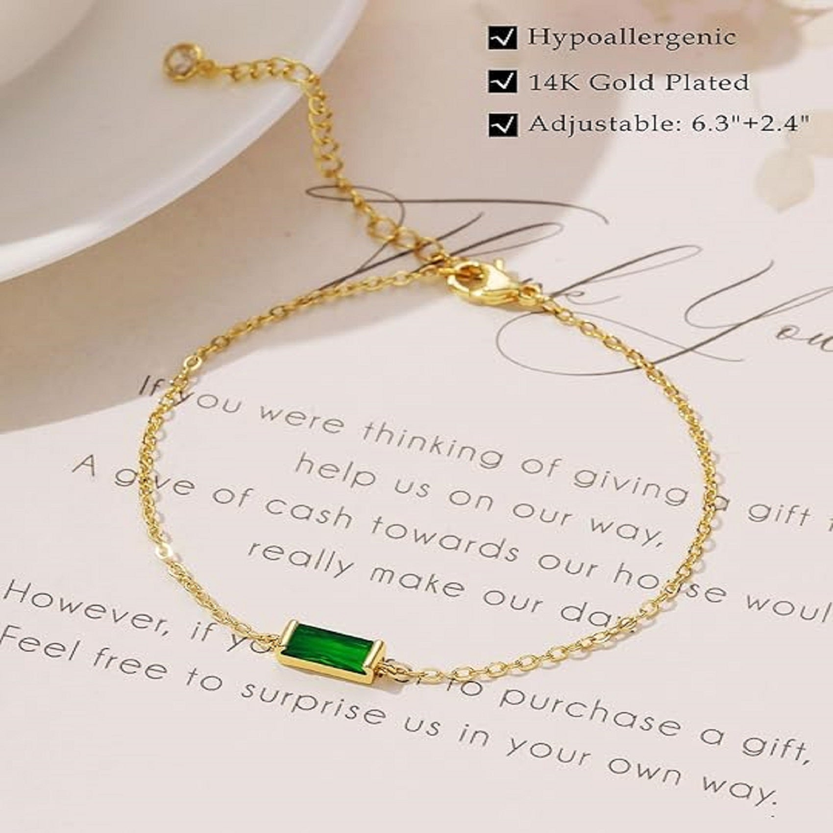 14K GOLD PLATED BRACELET: The birthstone bracelet consists of cubic zirconia(0.4cm*0.8cm) and 14K gold plated chain without nickle and lead, tarnish free, hypoallergenic.